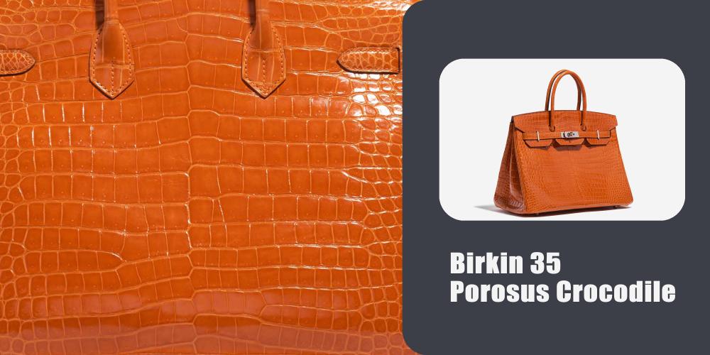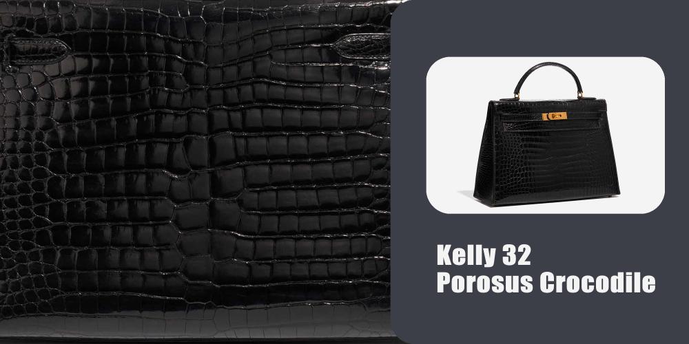 Crocodile Porosus comes from Southeast Asia and Australia. It is the most exclusive of all Hermes exotic skins. Porosus has a tighter, more refined scale pattern. When polished, the shine is extremely reflective, which is why collectors prize Porosus for high shine finishes and rare color executions.