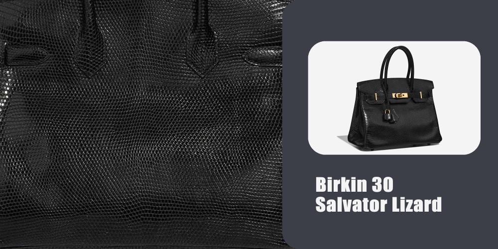 Hermes lizard leather is instantly recognizable by its tiny, bead like scales. It has a jewel like sheen even in matte versions. Most Hermes lizard bags have a glossy finish because the small scales catch light easily.