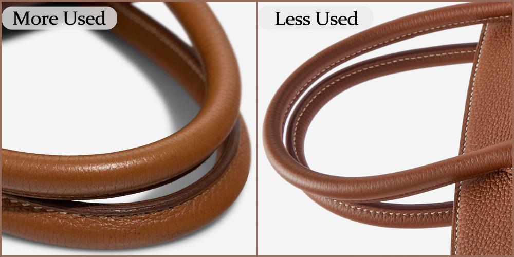 Detail photos of worn handles and creased straps show how leather responds over time and help distinguish normal wear from damage.