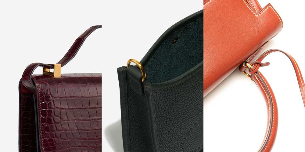 On bags with detachable straps, such as the Kelly, Constance, and Evelyne, the strap attachment points are major stress zones. These areas experience pulling force that changes direction as the wearer moves.